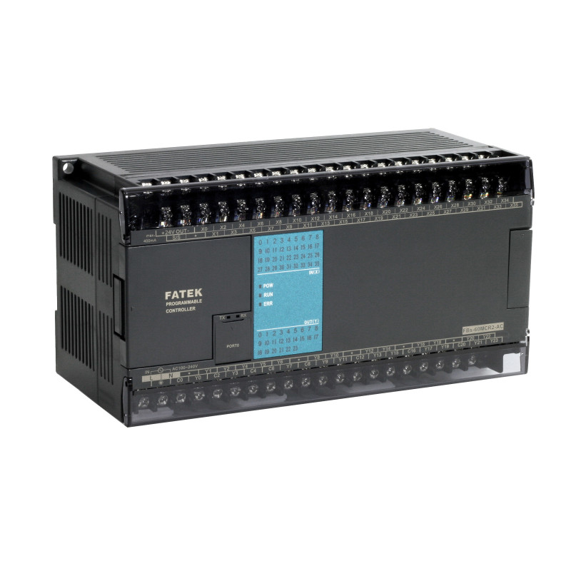 - El PLC FBs-60MCR pertenece a la Serie MC conocida como la avanzada a nivel industrial, esta posee 36 entradas digitales de 24 Vdc y 24 salidas usualmente de relé. Esta es expandible con todas las alternativas de expansión de Fatek. Esta destaca sobre la serie MA porque trabaja las entradas o salidas a alta velocidad (+100 Khz), ideales para el trabajo con señales de contador rápido o encoders.